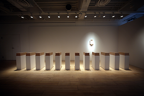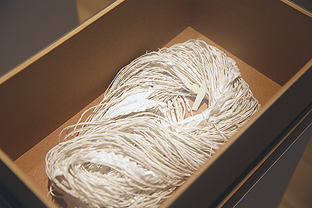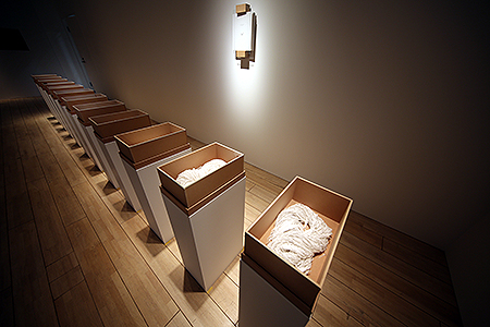 "Wings—dedicated to E—" 2015 12 garments as mementos of E and a catalog book of E's art works, wooden boxes, glass